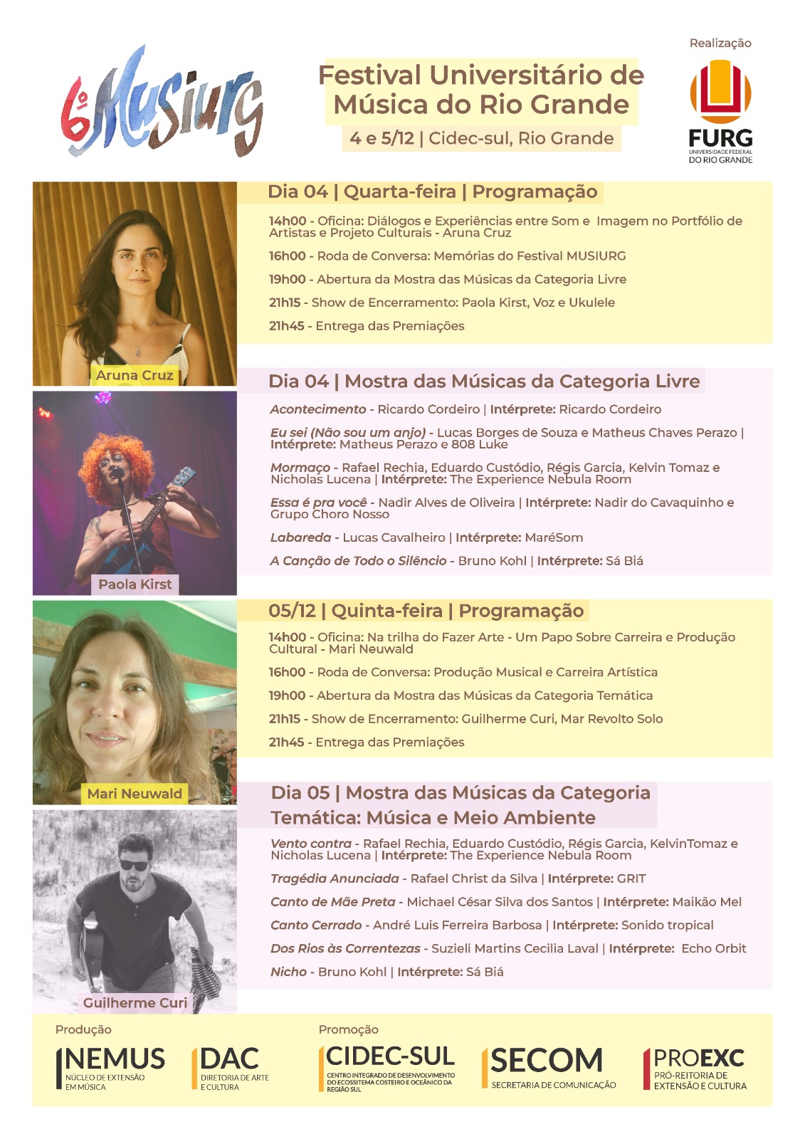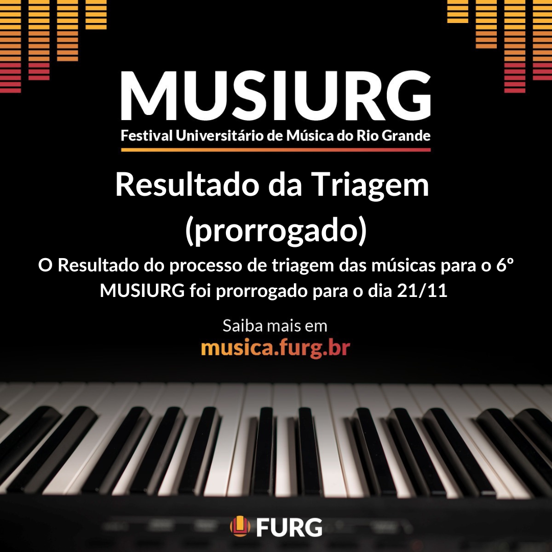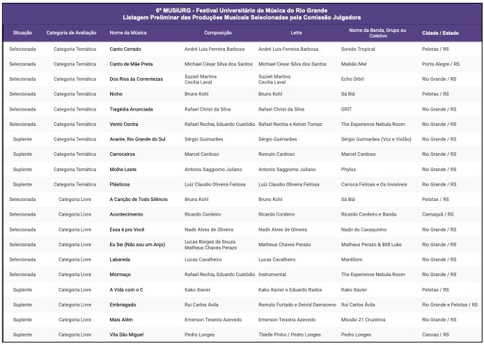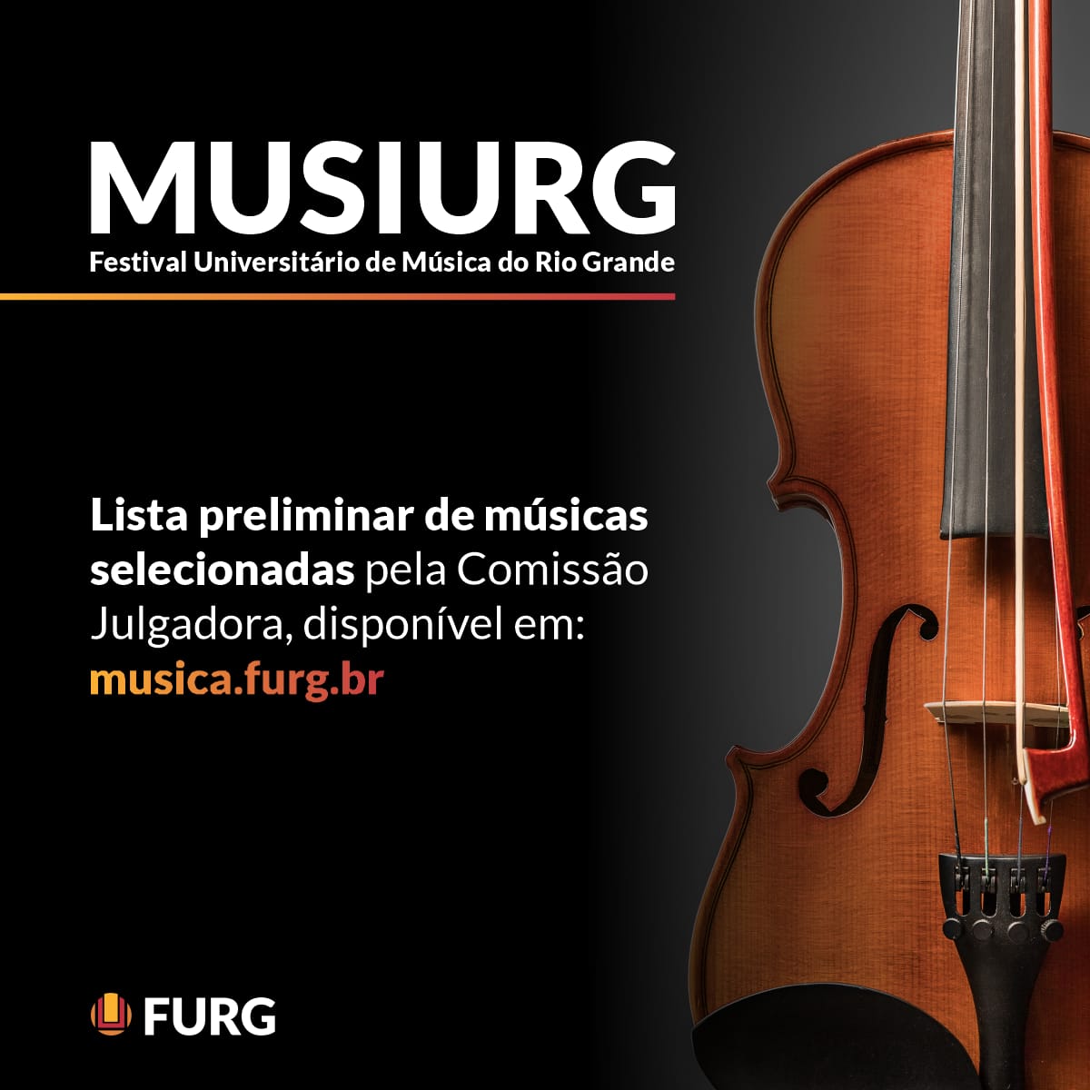 A Comissão Julgadora do 6º Musiurg, Festival Universitário de Música do Rio Grande, após realizar a escuta de forma individual das quase cem músicas enviadas para esta edição do festival, avaliou as mesmas de forma anônima quanto aos compositores e, a partir dos critérios do edital, elaborou a listagem preliminar das doze músicas selecionadas e suplentes nesta etapa da triagem. Confira a lista completa ao final do texto.